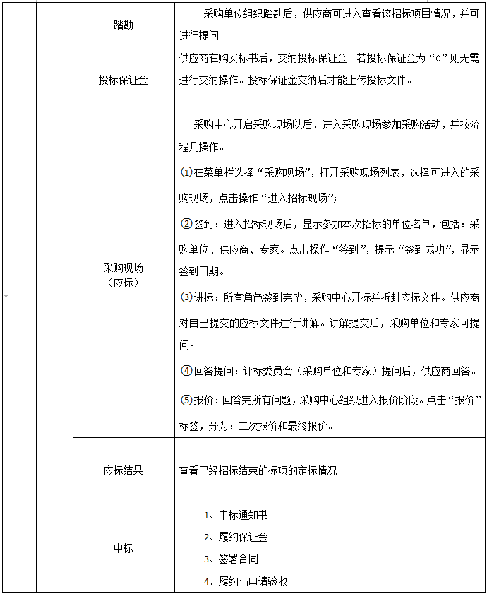 供應商信息、資(zi)格預審、采購(gou)文件、踏勘、投(tou)標(biao)(biao)保證金、采購(gou)現場(應標(biao)(biao))、應標(biao)(biao)結果、中標(biao)(biao)、驗收(shou)、支付