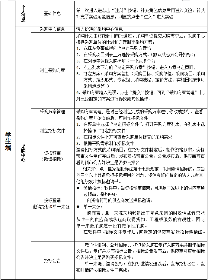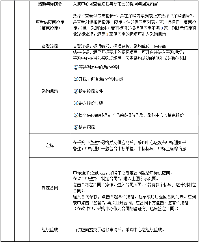 采(cai)購(gou)中(zhong)心信息、制定采(cai)購(gou)方案(an)、采(cai)購(gou)方案(an)管(guan)理制定招(zhao)標(biao)文件、資格(ge)預審(邀請(qing)招(zhao)標(biao))、投(tou)標(biao)邀請(qing)、邀請(qing)招(zhao)標(biao)&單一來(lai)源、招(zhao)標(biao)公告、踏(ta)勘與(yu)標(biao)前會、查(cha)(cha)看供(gong)應商投(tou)標(biao)、(結(jie)束投(tou)標(biao))查(cha)(cha)看流標(biao)、采(cai)購(gou)現場、定標(biao)、制定合(he)同、組織驗收