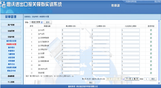 5、軟件分為管(guan)理(li)員(yuan)、教師、學生(sheng)(sheng)三種(zhong)用(yong)戶權限,管(guan)理(li)員(yuan)端(duan)主(zhu)要功能(neng)是設置教師用(yong)戶以(yi)(yi)及數(shu)據的維護。教師端(duan)主(zhu)要負(fu)責(ze)管(guan)理(li)學生(sheng)(sheng)用(yong)戶信息、設置學生(sheng)(sheng)實(shi)(shi)驗(yan)任務、維護實(shi)(shi)驗(yan)基礎(chu)數(shu)據、對學生(sheng)(sheng)實(shi)(shi)驗(yan)情(qing)況進行考核。學生(sheng)(sheng)端(duan)根據布置的實(shi)(shi)驗(yan)任務,完(wan)成實(shi)(shi)驗(yan)任務,熟(shu)悉報關相關規范、掌握報關業務流程以(yi)(yi)及單(dan)據的填制(zhi)。