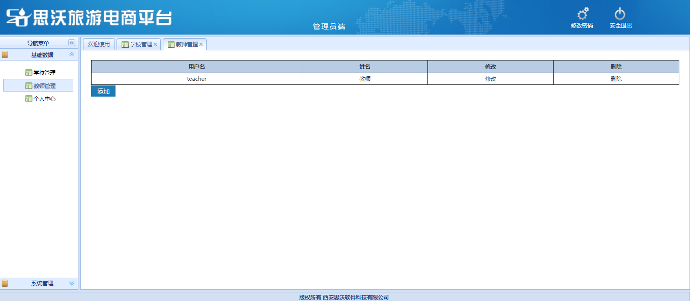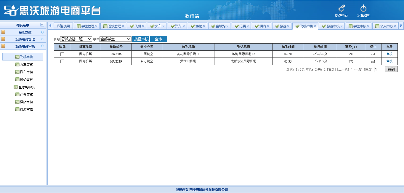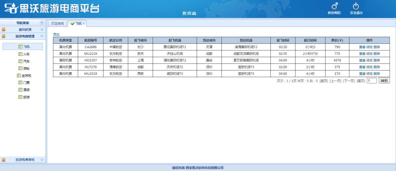 教師端包括:基礎數據(班級(ji)管(guan)(guan)理(li)、學(xue)生管(guan)(guan)理(li)、學(xue)生審(shen)核(he)(he)、個人信息(xi)(xi));旅(lv)游(you)(you)電(dian)商管(guan)(guan)理(li)(對學(xue)生發布已審(shen)核(he)(he)的(de)飛機(ji)、火車(che)(che)、汽車(che)(che)、游(you)(you)輪、全(quan)球購、門票(piao)、酒店(dian)、旅(lv)游(you)(you)產品信息(xi)(xi)進行(xing)(xing)管(guan)(guan)理(li));旅(lv)游(you)(you)電(dian)商審(shen)核(he)(he)(對學(xue)生發布的(de)飛機(ji)、火車(che)(che)、汽車(che)(che)、游(you)(you)輪、全(quan)球購、門票(piao)、酒店(dian)、旅(lv)游(you)(you)產品信息(xi)(xi)進行(xing)(xing)進行(xing)(xing)審(shen)核(he)(he))。