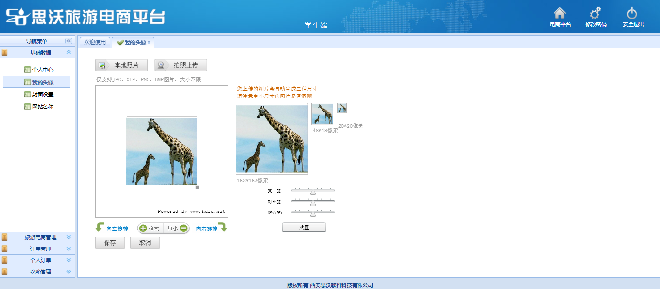 學生后臺網(wang)站(zhan)(zhan)頁面個(ge)性化操作,可通過攝像(xiang)頭等設(she)(she)備進(jin)行(xing)(xing)頭像(xiang)拍照上傳、也可上傳本地照片,行(xing)(xing)網(wang)站(zhan)(zhan)名(ming)稱及封(feng)面設(she)(she)置。并進(jin)行(xing)(xing)飛機、火車、汽車、游輪(lun)、全球購、門票、酒店、旅游產(chan)品、旅游攻略等信(xin)息添加(jia)發布(bu)。
