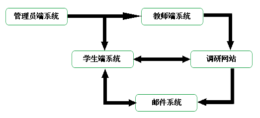 由管理員(yuan)端系統(tong)、教師端系統(tong)、學生端系統(tong)、調(diao)研網站、郵件系統(tong)五(wu)大部分組成(cheng),各(ge)部分之間(jian)數據相互(hu)交流聯系。